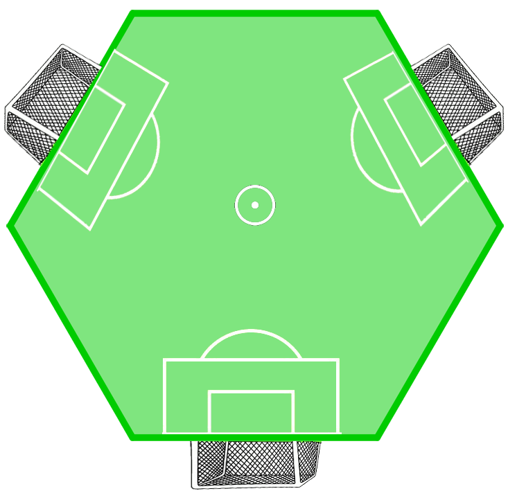 La cancha es hexagonal, a cada equipo se le asignan dos lados opuestos por motivos burocráticos en caso de que la pelota sea pateada hacia afuera de la cancha. El lado sin arco es llamado el frente. El lado que contiene el orificio es llamado la espalda. Cada vez que la pelota es pateada a través del orificio de un equipo, el equipo concede un gol -es posible decir que de manera emblemática esto aún perpetúa las técnicas homofobicas de retención anal del fútbol convencional donde la tensión homoerótica es construida sólo para luego ser reprimida. Sin embargo, la apropiación trioléctica de esta técnica disuelve la bipolaridad homofóbica/homoerótica ya que un ataque exitoso generalmente implica la colaboración entre dos equipos. Debe tenerse en cuenta que esto elimina la prominente resistencia por parte de las mujeres a jugar plenamente al fútbol. La penetración de la defensa por parte de dos equipos opuestos impone a la defensa la tarea de contrabalancear su desventaja numérica sembrando semillas de discordia entre los dos equipos opuestos que mantienen una alianza que tan sólo puede ser temporaria. Esto puede conseguirse mediante la exhortación, el lenguaje corporal y la habilidad de maniobrar la pelota y los jugadores de forma tal que uno de los equipos opuestos sienta que sus intereses se consiguen quebrando su alianza temporal con el otro equipo atacante y uniéndose en otro ataque con el equipo que defendía. Debe ser tenido en cuenta que esta decisión jamás es simultanea en todo un equipo y que en general todos los equipos se encuentran divididos en alianzas simultaneas. Esta posibilidad puede, sin embargo, ser utilizada por un equipo para atacar al equipo que en mayor confusión se encuentra. El Fútbol de tres lados es un juego de habilidad, persuasión y psicogeografía.