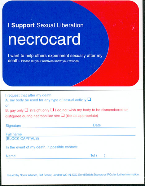 Con el paso de los años y el proceso de ir envejeciendo, he encontrado que mis ideas fijas volvían a ser siempre las mismas, seguramente son las mismas que tiene cualquier persona con una inclinación filosófica: el sexo y la muerte. Dado que deseaba abordar la relación entre estas dos cuestiones, me decidí a emitir tarjetas de donantes que permitan a quienes las llevan declararse como donantes de su cuerpo para la experimentación sexual tras su muerte. La creación y/o diseño de las tarjetas fue bastante sencilla, simplemente copié unas tarjetas oficiales de donación de órganos, pero cambién el texto. Mis Necrocards llevaban la leyenda: “Estoy a favor de la liberación sexual" y "Quiero ayudar a que otros experimentar sexualmente después de mi muerte". Las dos primeras imprentas donde encargué que impriman varias de éstas se negaron a hacer el trabajo. El dueño de una de ellas me dijo luego que si se hubiera dado cuenta que era apenas una broma, las hubiera impreso sin problema.