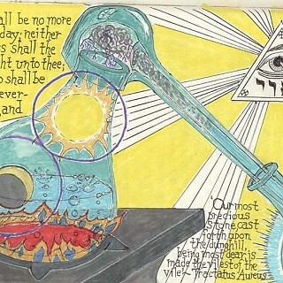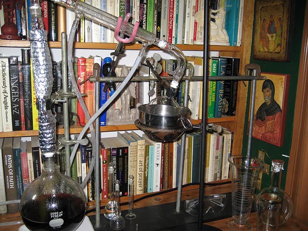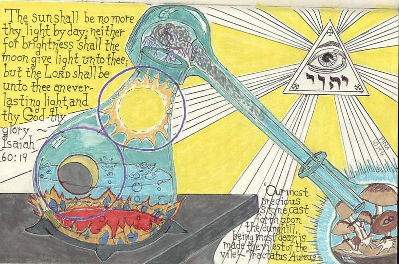 (Jessie Fischer)Nuestras mesas están adornadas con los colores de nuestro arte, desde la oscuridad y la luz, al rojo sangre del corazón. El búho de Atenea nos regocija con signos de su sabiduría, y las plumas que fluyen como guías de Hermes, llegan a las garras que nos muestran lo que Terra premió. Con mortero y pisón, molemos la Vida y su Matraz, para que luego con el fuego podamos llevarla a lo más alto. Tan pura como el cristal recibimos la Luz Divina, para fijarla y mostrar su poderío. Porque incluso cuando es fijada, su poder permanece sutil, como el perfume de una rosa, o el murmullo de una serpiente. Bendito y sagrado es el lugar de nuestro arte, en la Naturaleza, el Laboratorio, y el Corazón del Alquimista.