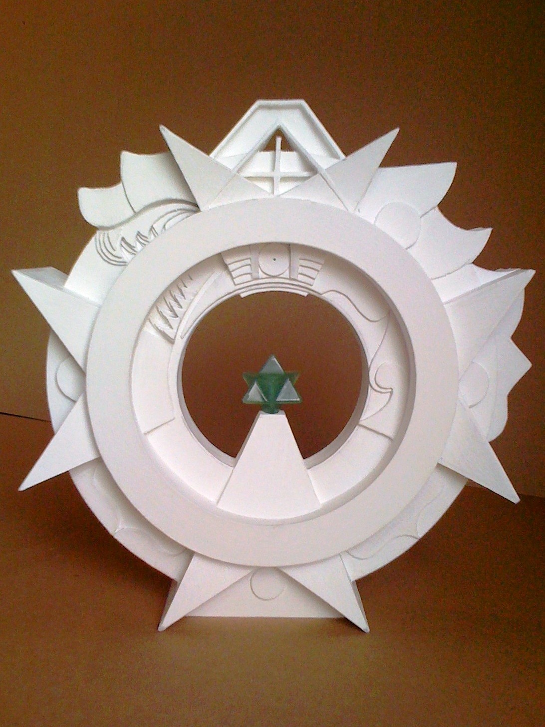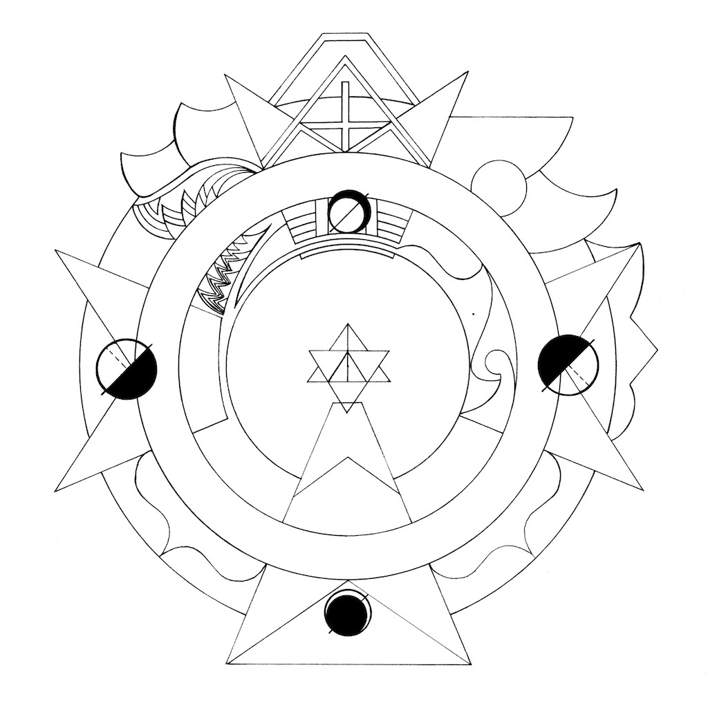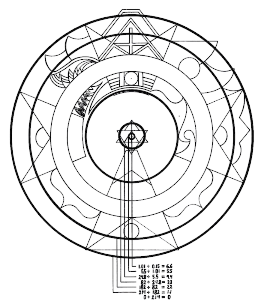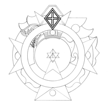 The base is another composite of images and ideas one of those is the chief corner stone here seen from the back and in the center a triangle within a circle in the book LIBER MMCMXI a note on Genesis is found a diagram description that relates to a triangle inside a circle. There is reference of the trinity incomprehensible and the trinity manifestation. Where by creating a concentration of the 3 in one giving rise to a 4th that creates 6 paths which addition is 10 creating the decade of the sephiroth. [9]