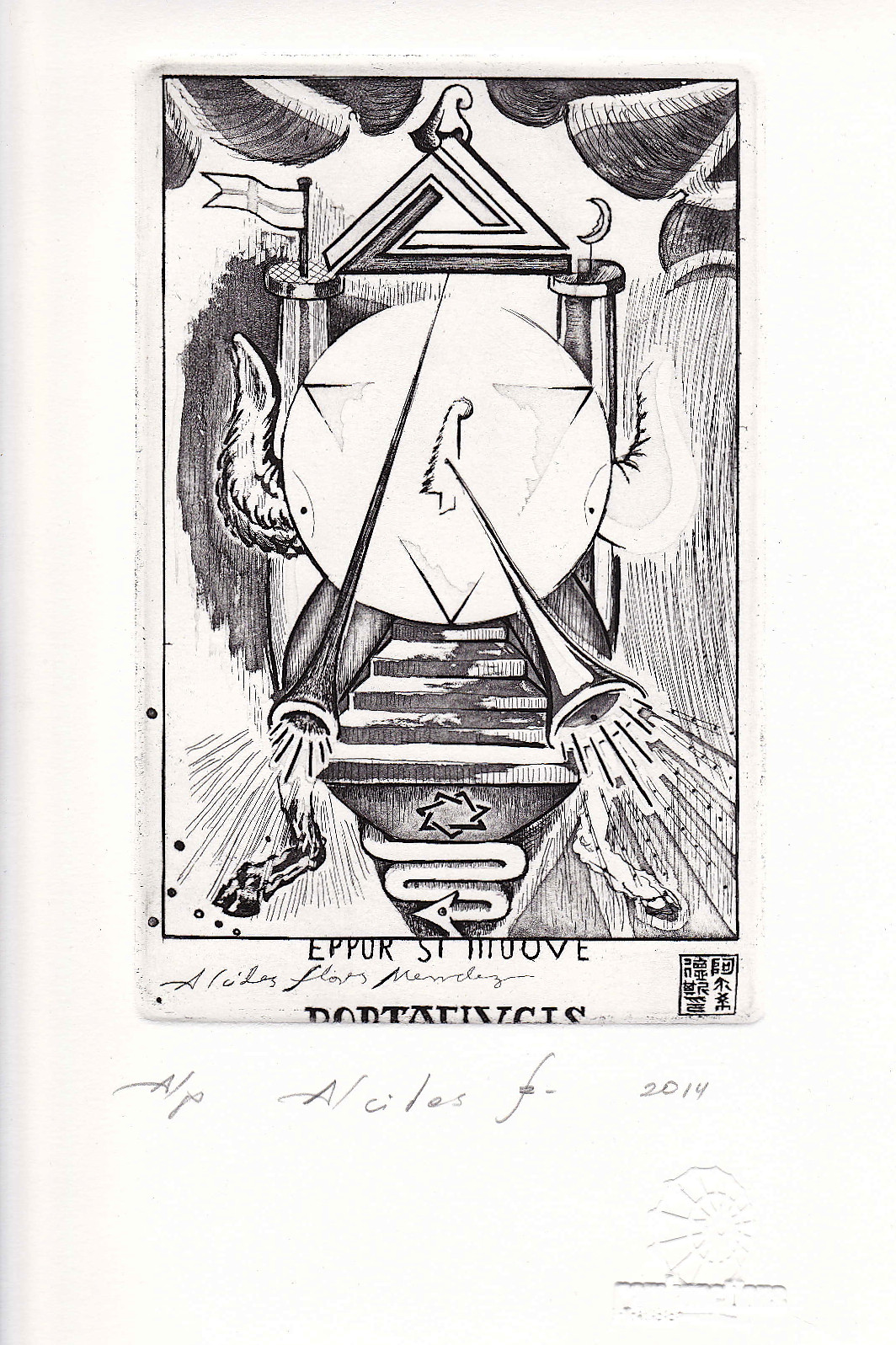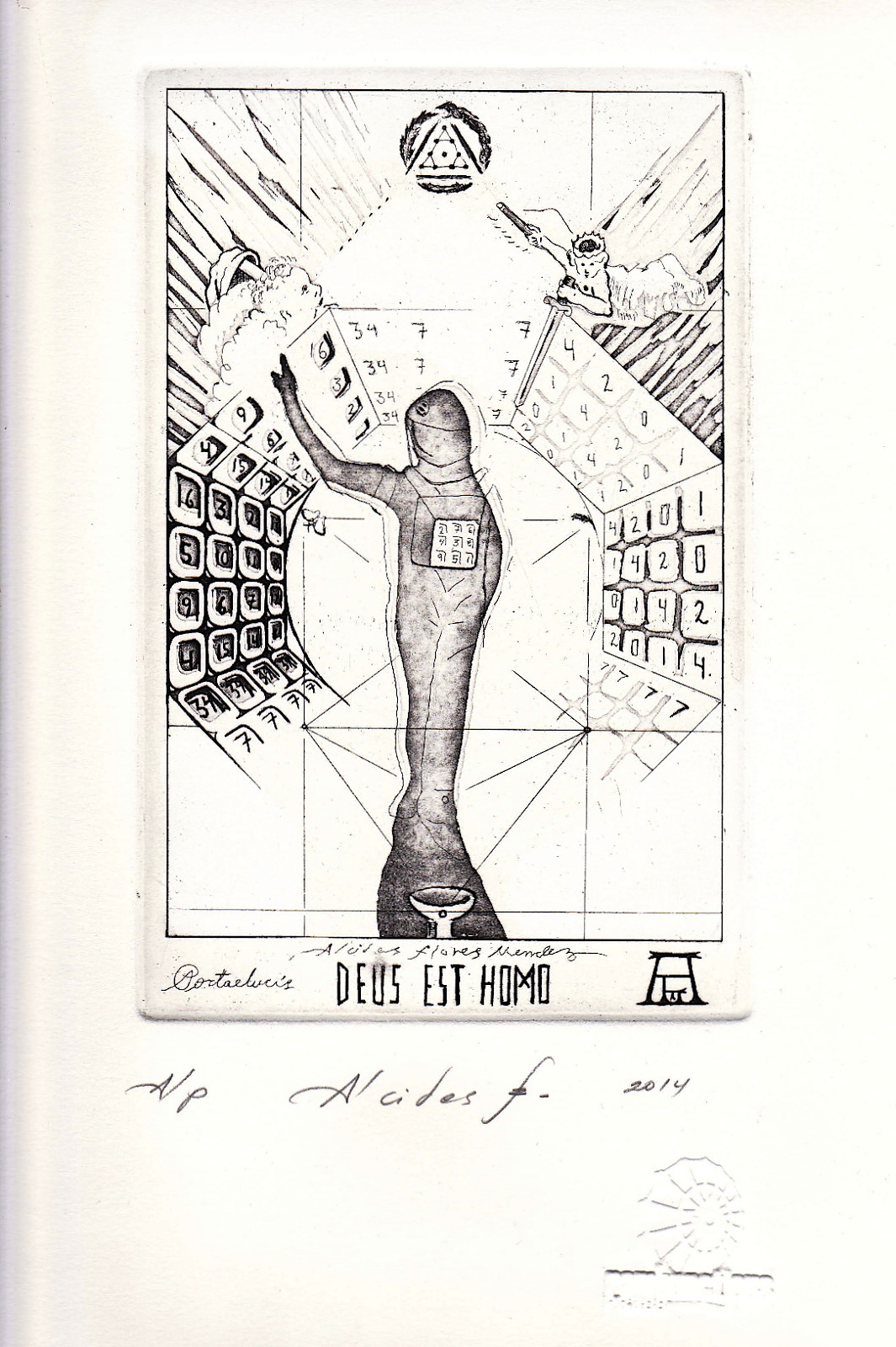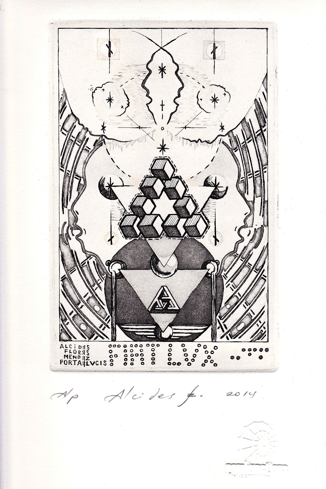 Plate 3 celebrates 500 years of the publishing of the Fama Fraternitatis and also Albrecht Dürer "Melencolia I " 1514 it references geometry. Derives the magic squares to date the work in connection to 2014 by numerology reduction to 7's. The initials AFM in the plate are stylized according to Albrecht Dürer's AD. The numbers 8,5,3 are represented in geometric forms. The protagonist is thus found within an octagon (8) his head brakes through to a pentagon (5) that crosses his temple and a triangle (3) is found high above. The number reduction of the geometric forms gives us seven; 8+5+3= 16, 1+6 = 7
