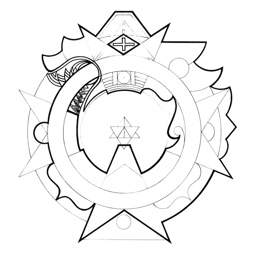 An image that is perhaps among the most predominant of those found in the “O” sculpture is that of the Snake eating its own tail or dragon or Ouroboros. We see such snake in the collar of the 18th degree in the Scottish Rite. We also see it in the Orphic egg were the serpent represents the mysteries. “The Mithraics used the serpent as an emblem of Ahriman, the Spirit of Evil, and water. [3] We also see it as part of the emblem of the Theosophical society. It is also found in as the Ouroboros from Alexandrian Egypt “All is one”. The Chinese Ouroboros from the Chou dynasty 1200 BC and surrounding double triangle of Solomon.
